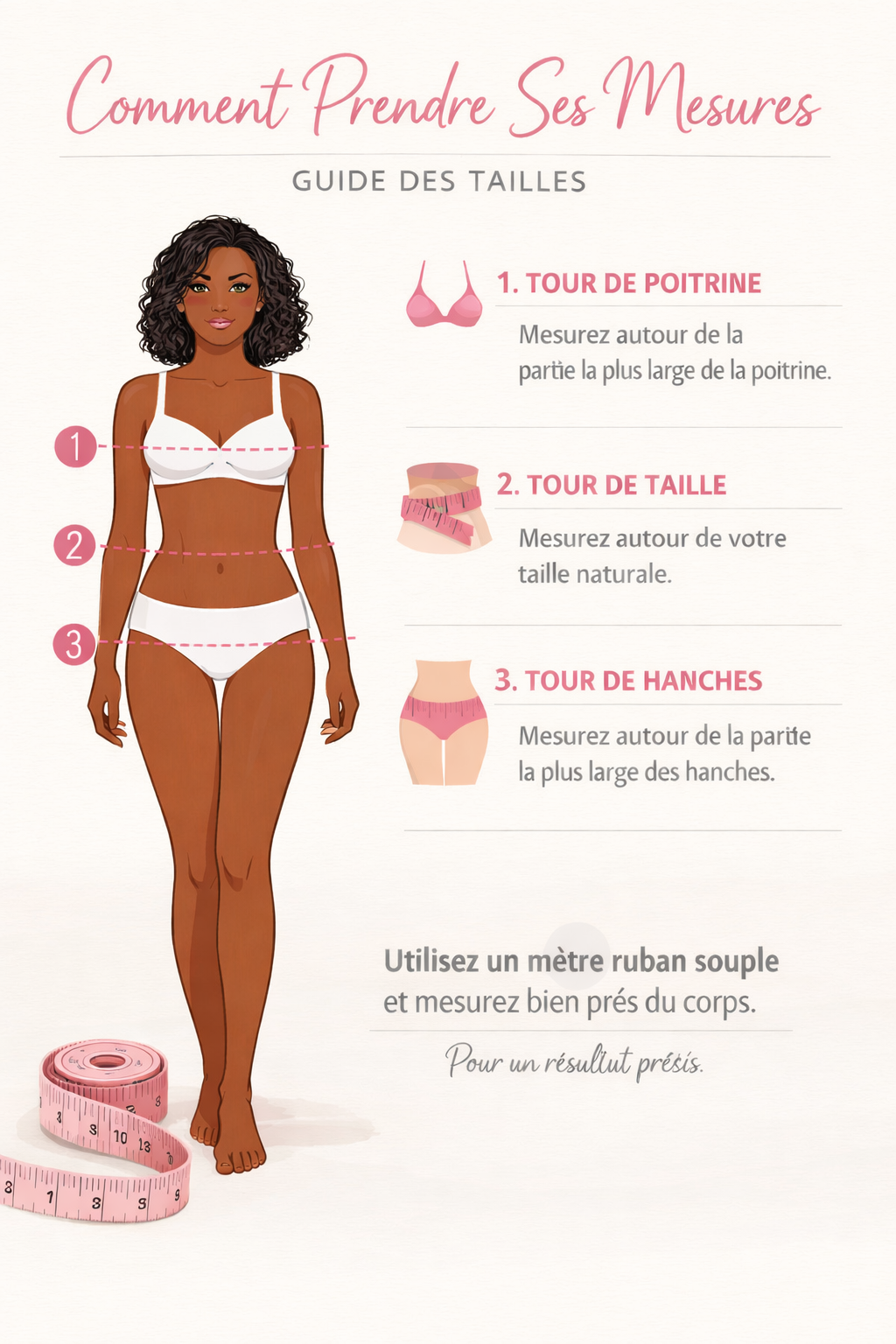 Pour profiter pleinement de votre piéce Sisters of Afrika, prenez quelques secondes pour mesurer votre poitrine, votre taille et vos hanches. Des mesures précises garantissent une coupe flatteuse, un confort optimal et un style qui sublime vos courbes.